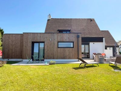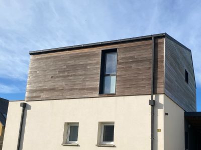 - Un chantier rapide : les éléments d’ossature bois (murs, charpente) sont fabriqués au préalable dans notre atelier. De plus, ce mode de construction ne requiert pas de temps de séchage. La mise en place de l’extension, de l’isolation et du bardage est ainsi réalisée en moins d’une semaine.